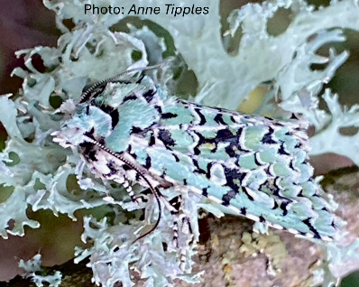 Its cryptic colouring and pattern has evolved so it is concealed on lichen, usually on the bark of old oak trees. With a wingspan of up to 50mm it is a spectacular moth, most likely to be seen in Autumn. When its eggs hatch in spring the caterpillars feed first first on the tree’s buds, then its flowers and eventually its leaves.