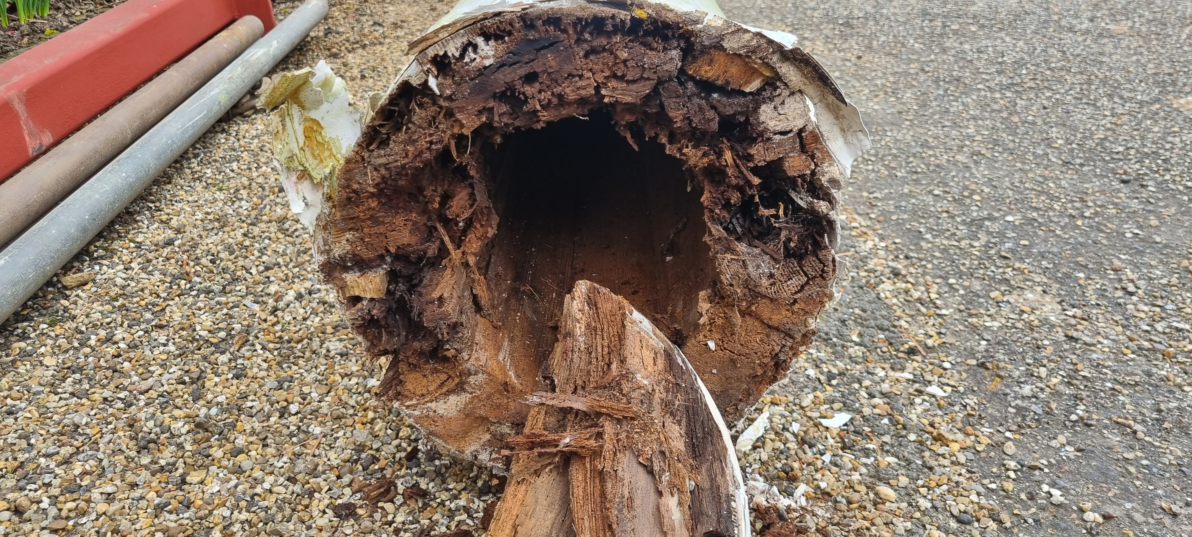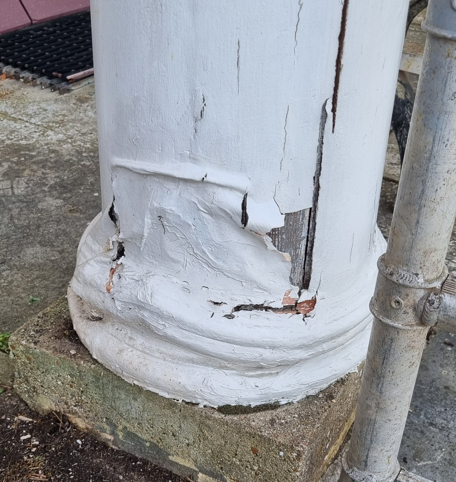 Emergency props were put in place to avert a complete collapse, and the owners went in search of remedies. Once the pillars were removed, it became clear that they had rotted away over the years and could not be restored.