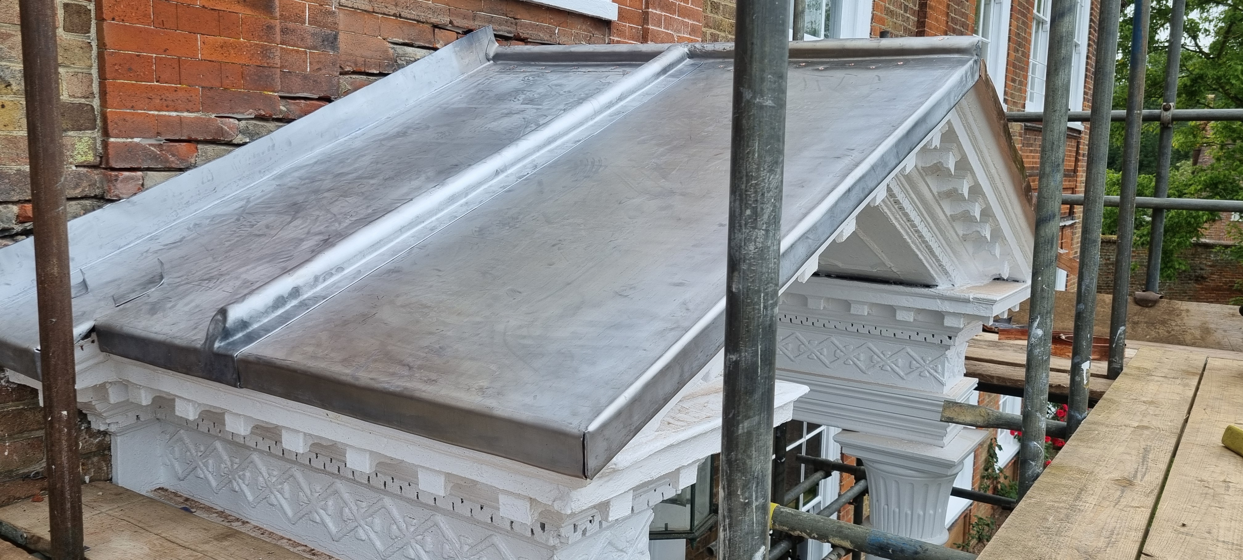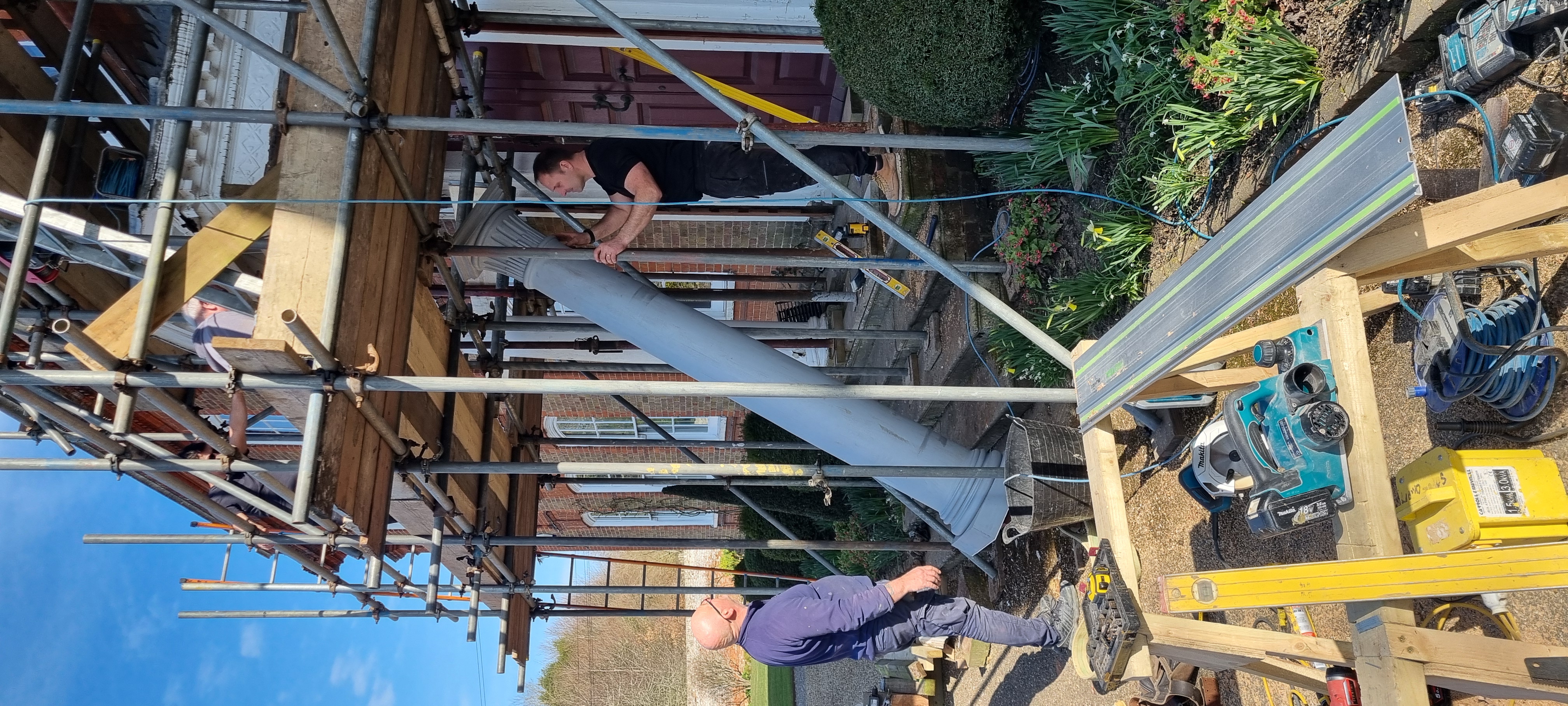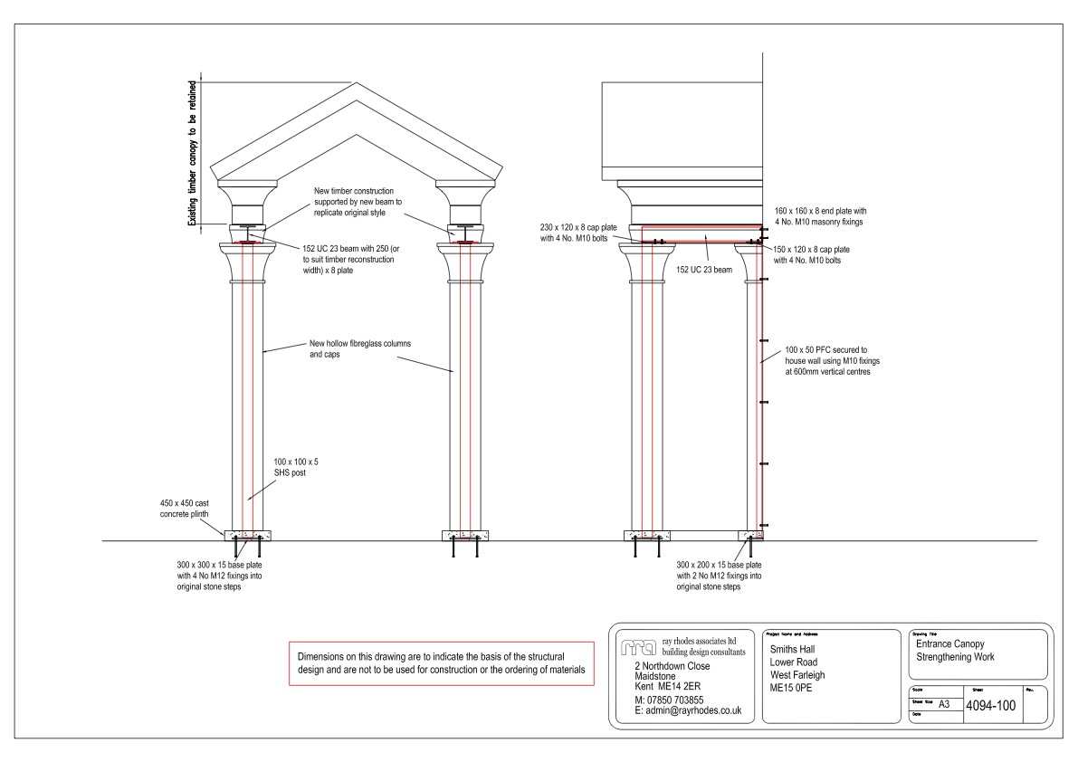 The local firm of Benchmark Joinery was engaged to create new pillars of the same design as the original. The heritage officer from Maidstone Borough COuncil specified that the new pillars must be stronger than the old ones and approved a design in which both pillars would have steel joints inside, but also there would be steel supporting the roof and running back to further steel joints hidden inside the faux pillars at the back of the porch.